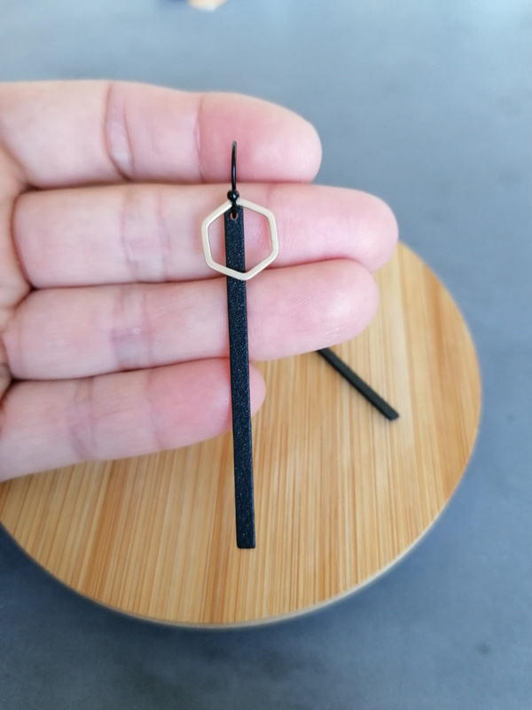 OverzichtGoudkleurige oorhaken met goudkleurig staafje en zwart open zeshoekje. Ook in zwarte versie beschikbaar!