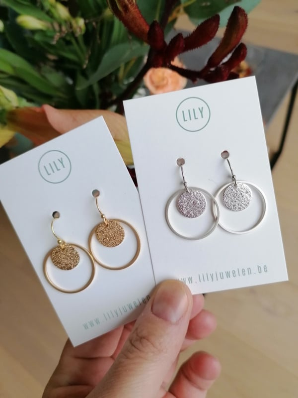 Goudkleurige oorhaakjes met schijfje en cirkel. Ook in andere kleurtjes beschikbaar!