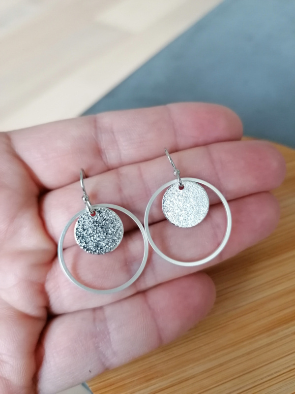 Zilverkleurige oorhaakjes met schijfje en cirkel. Ook in andere kleurtjes beschikbaar!