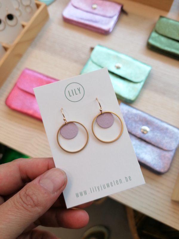 Goudkleurige oorhaakjes met lila schijfje en goufkleurige cirkel.