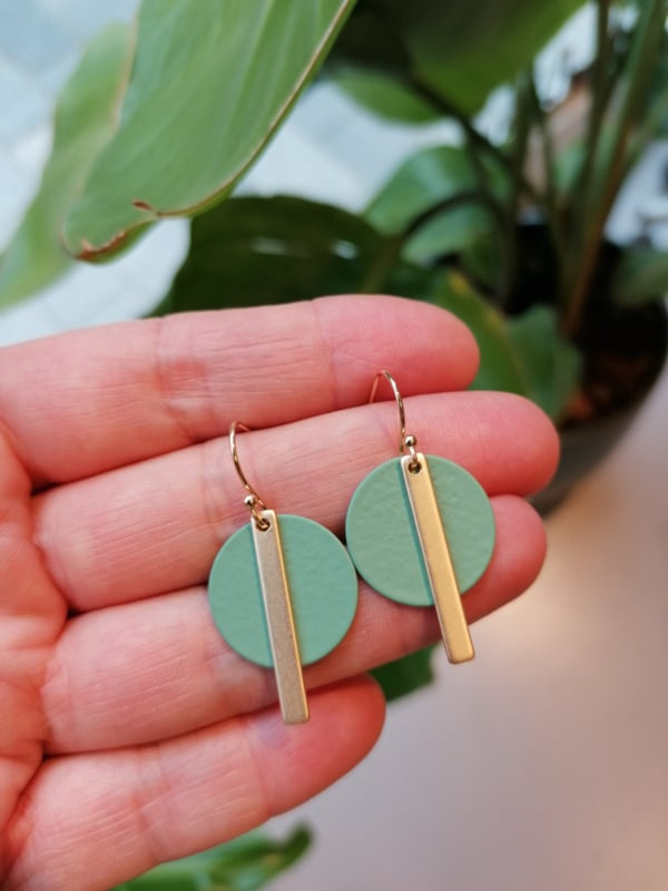 Grijze oorstekers in hars met goudkleurige cirkel. Totale lengte: 4cm