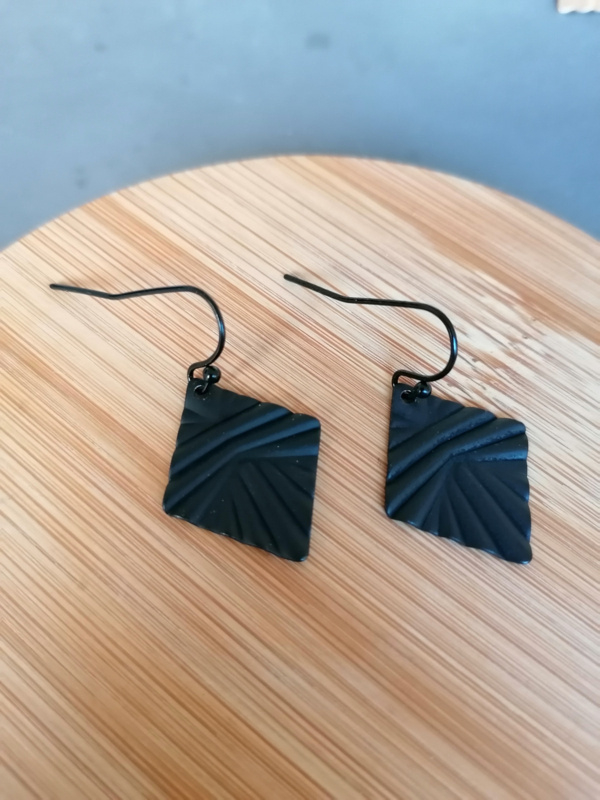 Zwarte haakjes met een ruitvormig, gegolfd bedeltje Lengte: 3,5cm