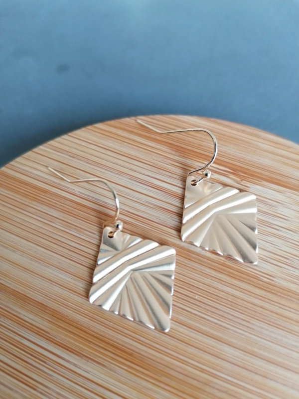 Goudkleurige haakjes met een ruitvormig, gegolfd bedeltje Lengte: 3,5cm
